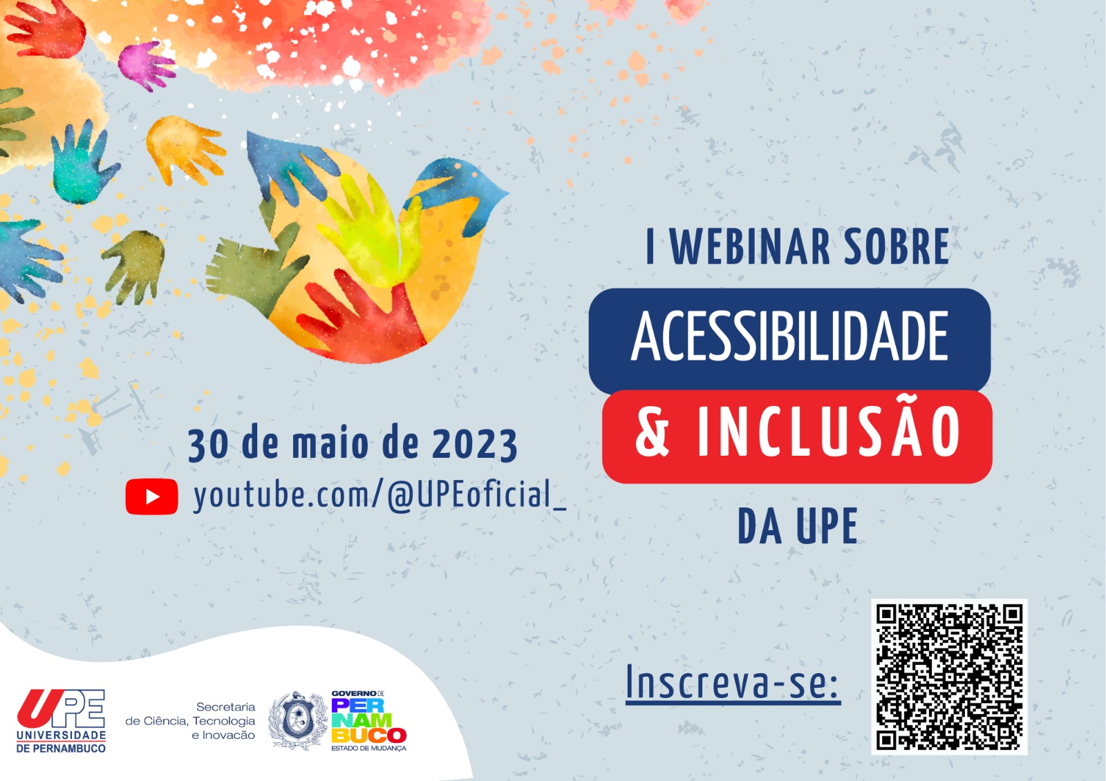 A Universidade de Pernambuco (UPE), através do Núcleo de Acessibilidade e Inclusão (NAI), promove o I Webinar sobre Acessibilidade e Inclusão. A atividade acontecerá no dia 30 de maio de 2023, com transmissão pelo canal da UPE no Youtube, com o objetivo de contribuir com o acolhimento do semestre 2023.1, com o intuito fomentar a discussão sobre temas relativos ao núcleo junto à comunidade acadêmica. Será conferido certificado com 2h de atividades e as inscrições podem ser realizadas através do link: https://www.even3.com.br/i-